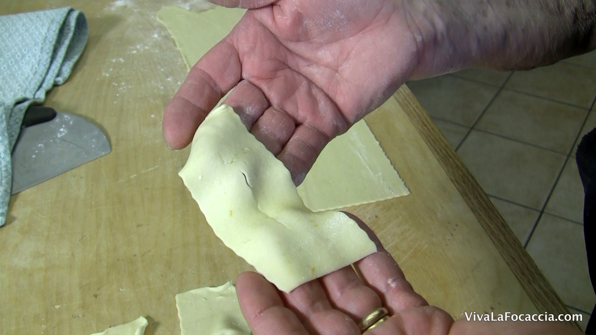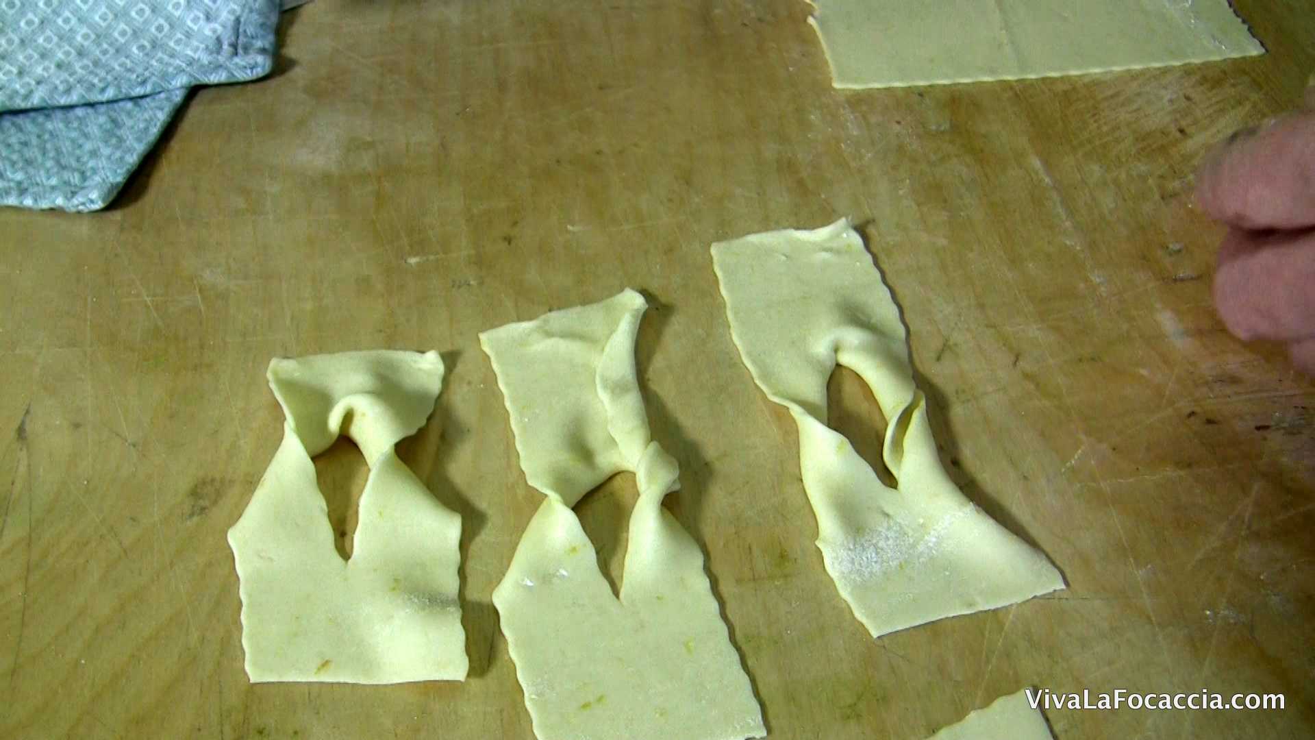 Con lo stesso impasto, eccetto il burro, ho fatto dei ravioli dolci ripieni di marmellata di prugne: la prossima volta li provo al forno. E i ritagli, cosa vuoi buttarli? Fritti anche loro!