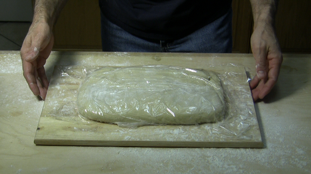 Cospargete la superfici superiore di farina e coprite con un altro foglio di pellicola trasparente