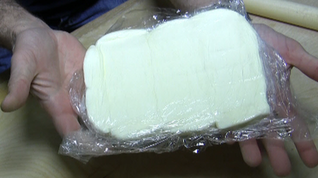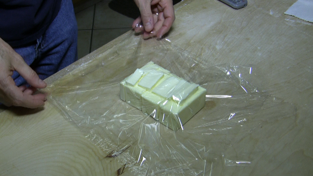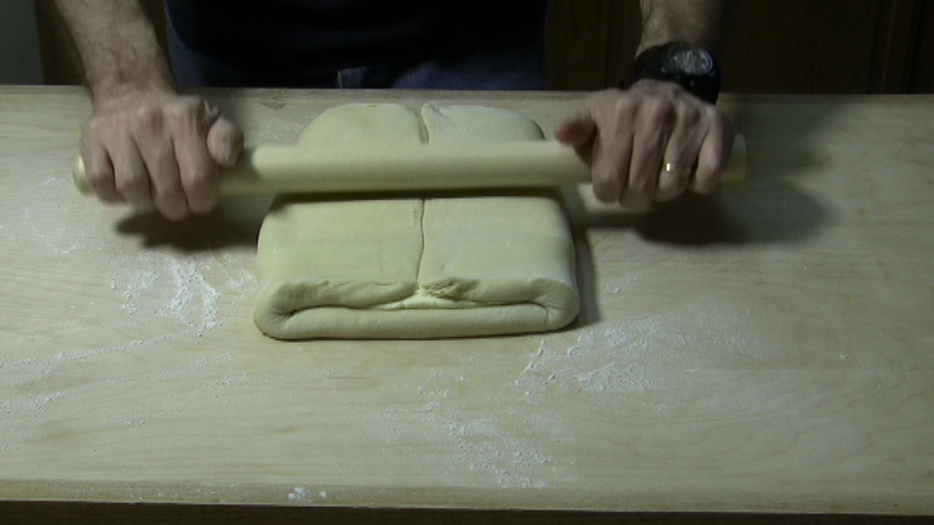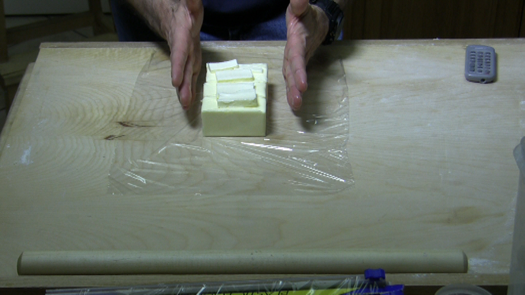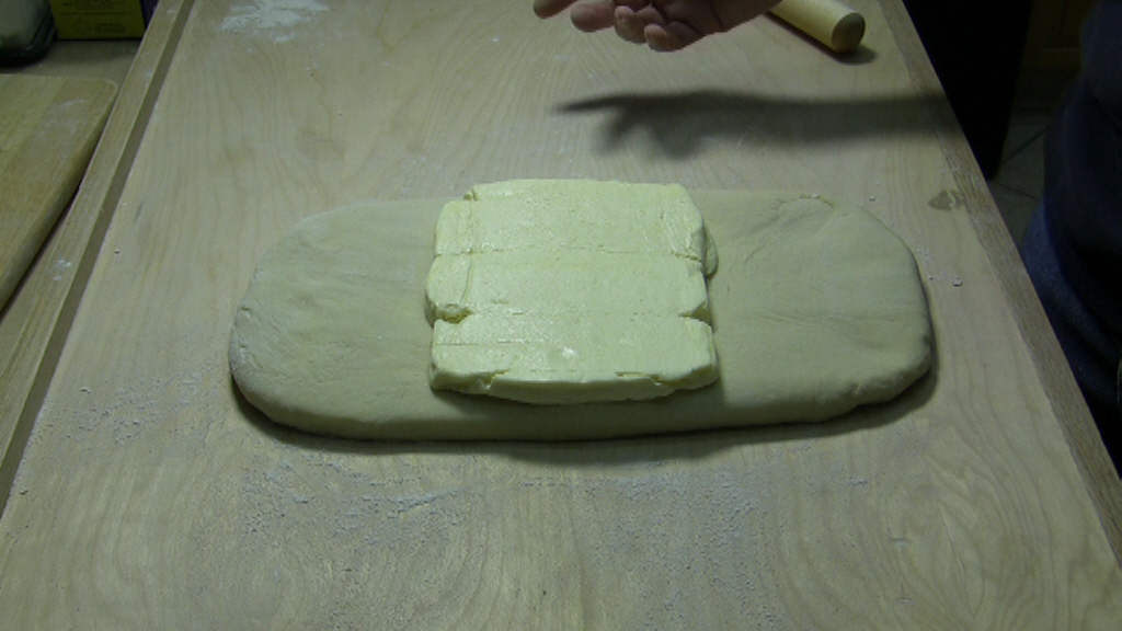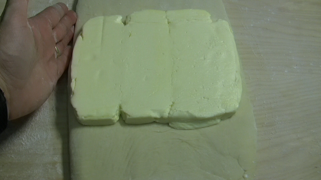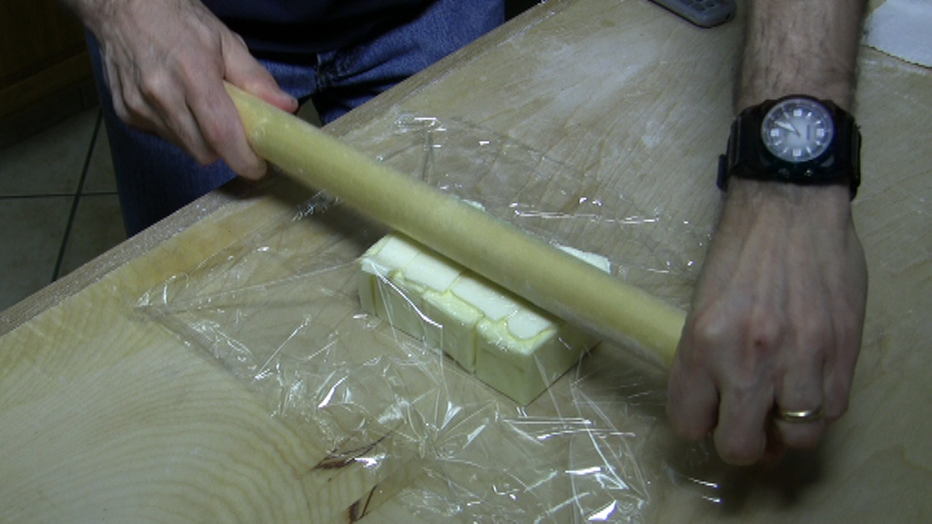 Picchiando con il mattarello, assottigliate il burro facendo in modo che mantenga una forma rettangolare