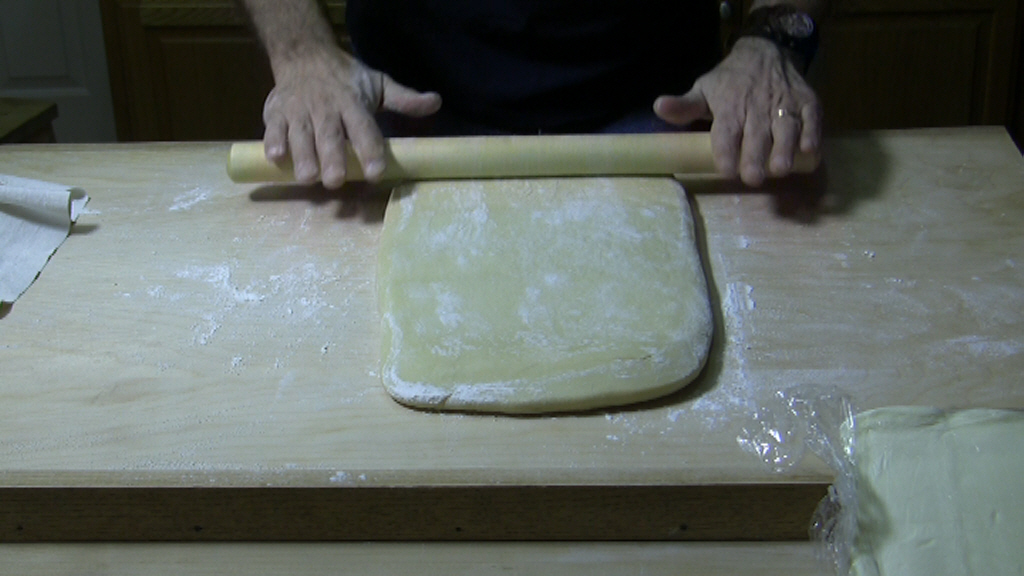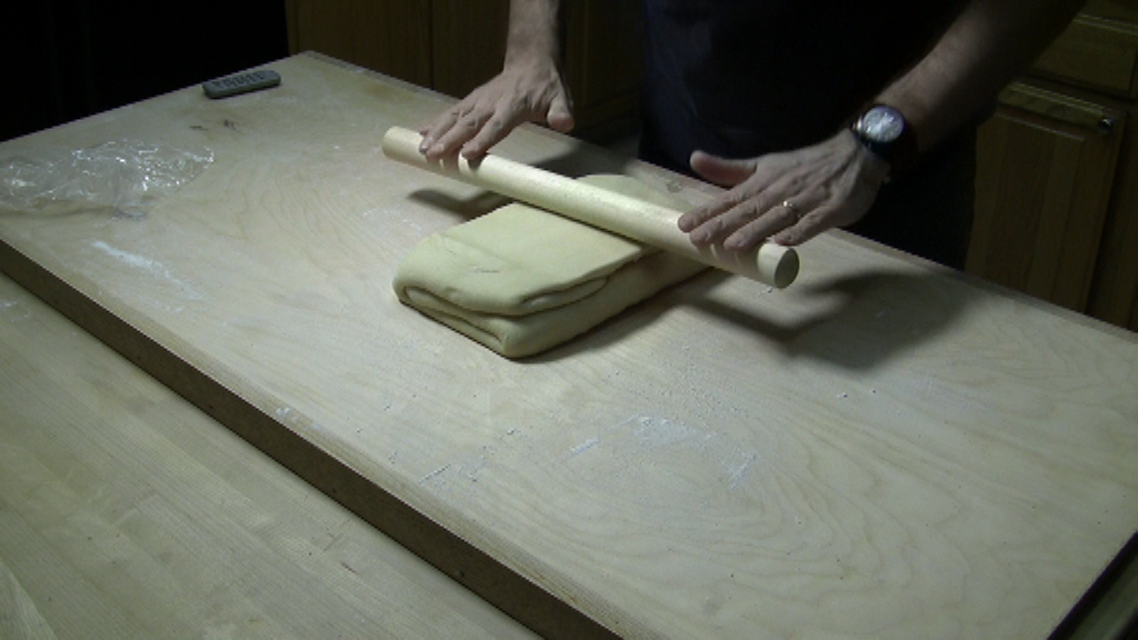 Girate la pasta di 90 gradi .Picchiando con il mattarello, iniziate ad assottigliare la pasta.Questo serve a distribuire bene il burro per formare uno strato omogeneo senza che si mischi con la pasta