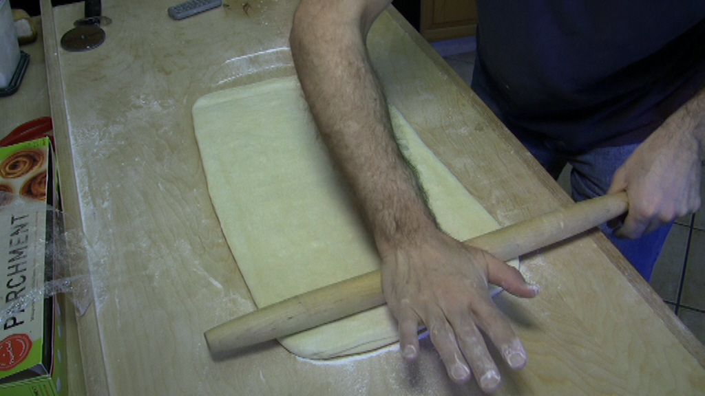 Dopo 15 minuti tirate fuori la pasta da frigo e stendetela fino ad ottenere un rettangolo largo come il lato più lungo del burro (circa 22-24cm)