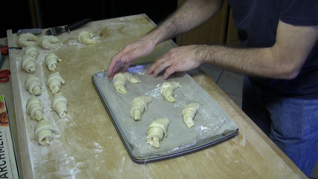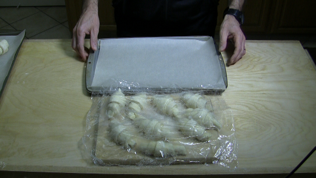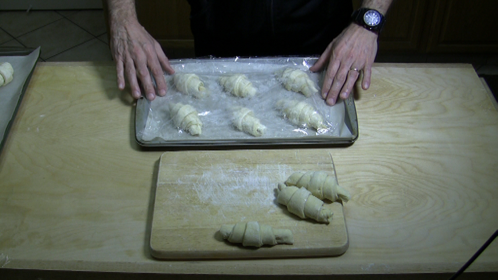 Se cuocete i croissant in giornata, metteteli su una teglia ricoperta da carta forno.Assicuratevi che siano distanziati perché cresceranno durante l lievitazione Copriteli bene con la pellicola trasparente in modo che non facciano la crosta e fate lievitare per 2-3 ore ad una temperatura ambiente di 20-22 c (non troppo caldo altrimenti si scioglie il burro)
