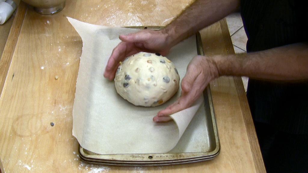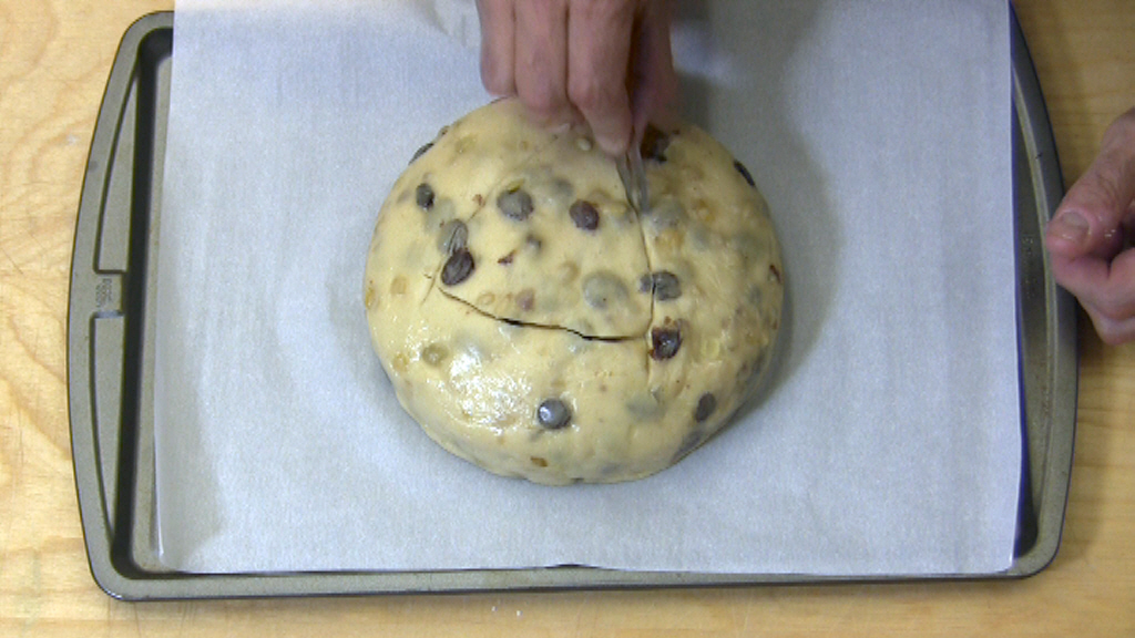 Con una lametta od un coltello molto affilato intagliate il tradizionale triangolo sull superficie con un taglio profondo 1 1/2 cm. Questo serve sia come decorazione ma anche e sopratutto per permettere al pandolce di svilupparsi ed aprirsi in forno durante la cottura.